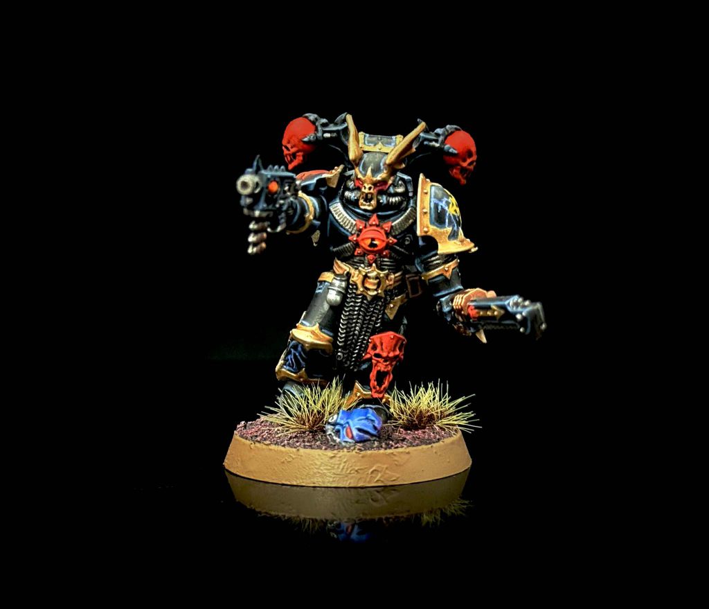 Like, look at the menace this guy exudes. Stalking through the breach, hunched over and crackling with supernatural lightning. There’s no pretense of dignity here, of any semblance of the nobility and honor of the Astartes. Despite their corrupted nature, there’s still a warped dignity to the way Chaos Marines are often depicted in art. It makes me think about the typical black knight archetype from fantasy literature, something that was once steeped in martial grace now given way to a dreadful visage, that same grace being employed now for a more sinister purpose.