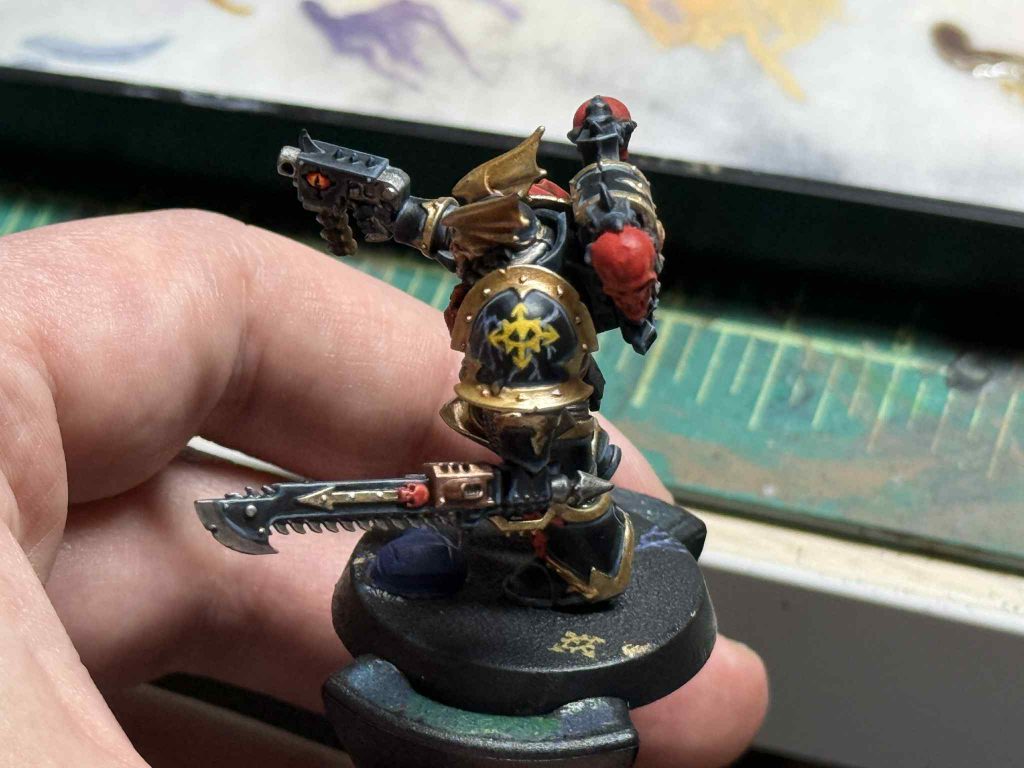 The momentum from the heavy gunner spilled into my decision to paint a bespoke Nemesis Claw warrior for the team, instead of just using one of my other Legionnaires to fill the role of “dude with chainsword.” If I was having fun before with the Gunner, but the Warrior the kind of absolute blast to paint that comes with the perfect union of high hobby energy on a cool looking model. I was having such a good time, in fact, that I allowed myself to get carried away. I just waxed poetic about how the lightning looks cool on the Night Lords, why not try to freehand some myself? And while we are out here in freehand town, hey, lets paint the Black Legion icon on this guy’s pauldron too. In for a penny, in for a pound.