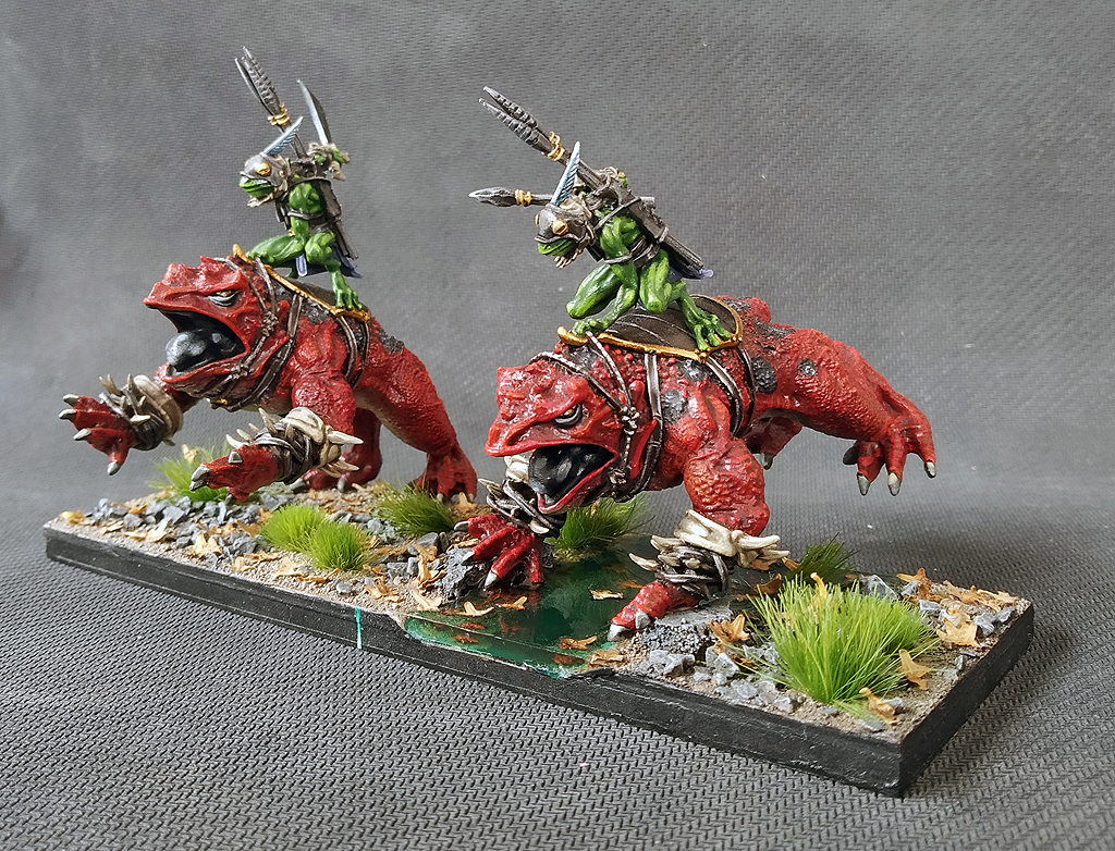 These frogs are faster than infantry but slower than cavalry, so depending on the opponent they might want to be hidden behind your lines. Their primary purpose is to hunt for those flanks, which thanks to their Leaper special rule combined with Fly and Nimble, they can readily find and exploit. Which is good, because at Melee 4+ they are not particularly deadly in the front facing, doing an average of 3-4 damage. Be patient with the Riverguard and you’ll be rewarded.