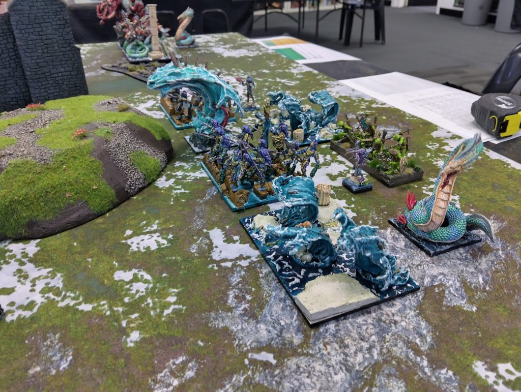 The Nokken Shepherd upgrade gives them a nice little shooting attack for only 5 points on the regiment. If there’s no Magic Artefacts to be spent on units, this certainly isn’t a waste of points. With Piercing (1) and Steady Aim, the enemy can’t ignore it! And it’s only coming from a cheap, throwaway unit. Put your shooting Tidal Swarm in front of your dangerous Gigas, and force the enemy to charge the Tidal Swarms with annoying Tidespray shooting!