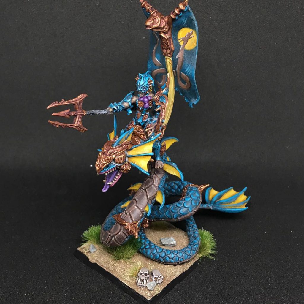 The Wyrmrider Centurion is a Large Cavalry Hero of the Wyrmrider variety. The damage potential isn’t bad, and it’s quite tough with Regeneration (4+) and Defense (5+). The only downside of the Wyrmrider Centurion is when it is compared to other units in the army. If you want a fast disruptor of the enemy, the Knucker is cheaper and in most ways superior. If you want a unit with Inspiring that can score points in the scenario, the Depth Horror Eternal is much cheaper. If you don’t even want something with Unit Strength then the standard Naiad Centurion is far more useful with the Trident of the Drowned Sea. The Wyrmrider Centurion is not a subpar unit, but it just isn’t as exciting as a lot of the other units Trident Realm has on offer.