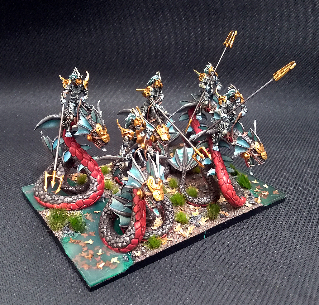 Like so many units in the Trident Realm, the real trick to getting the most out of Wyrmriders is making sure they get to combat. With low defense and a massive Height 4, everything on the board will want to shoot them. Regeneration (4+) will help with that, but the key is to ensure that as few enemy units as possible can shoot them at one time. Wyrmriders can handle the odd Lightning Bolt, but no unit can regenerate when it’s dead. This means using forests and tall terrain to protect them from being shot. Finally, make sure they don’t get charged, unlike most Naiad units the Wyrmriders do not have Ensnare. Use their Nimble movement to out maneuver the opponent. As you can see, like a lot of Trident Realm units, Wyrmriders are not straightforward in their use, but they are a good unit that can do damage when used well. Team them up with the slightly faster Knucker for a real slippery eel combo.