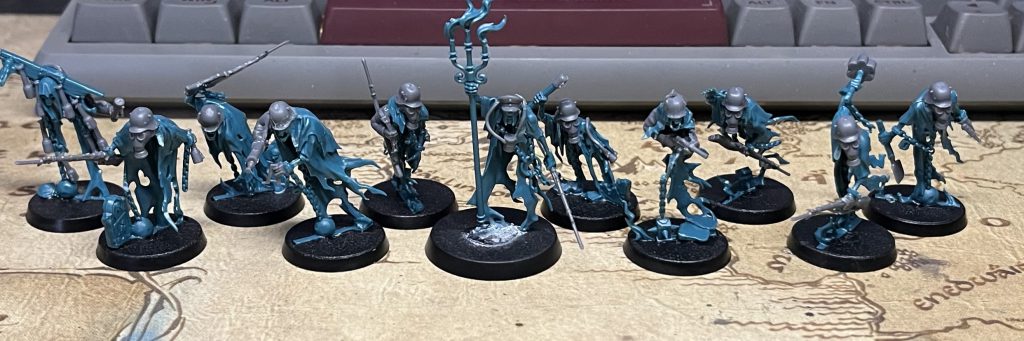 I really wasn’t sure how this was going to go, so I didn’t document with photos each step, being then pleasantly surprised that they all just worked out in the end. I really, really, was not expecting that I’d be able to make this work. The Chainrasp sprue is only meant to build 10 guys with the ghost in stockade sharing parts with the one holding up the big candle stick; thankfully they’re ghosts so missing part of their body doesn’t actually mean much and you get a “full” eleven guys out of this. Look, I still have no idea how many you want in a game, maybe you want more? No clue. Eleven seems like a good number for what’s meant to be a skirmish game. Right?
