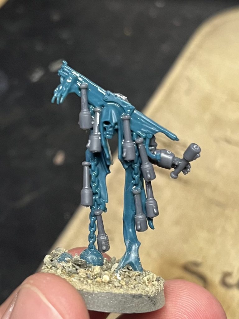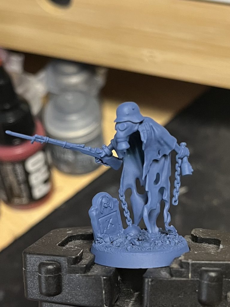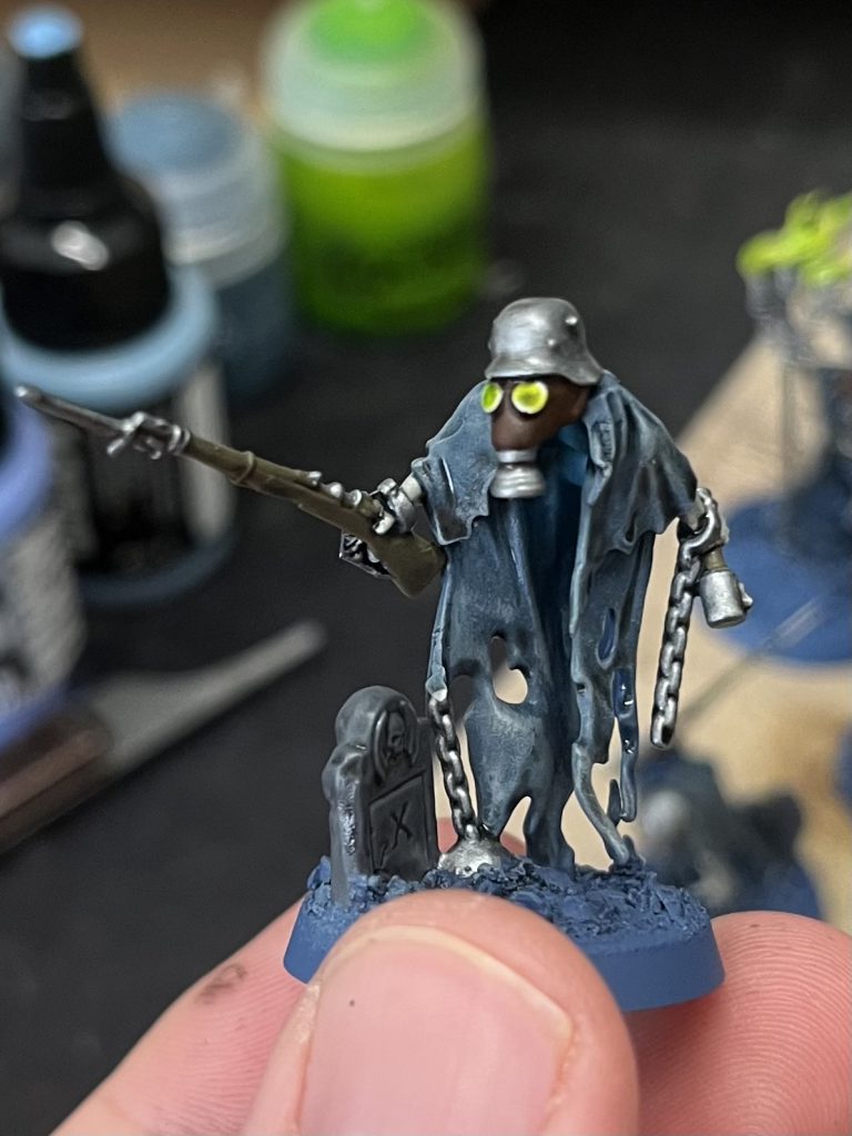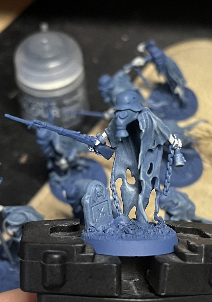 Thankfully this was even simpler than the building part! I wanted them to be ghostly bluish-grey things floating across no man’s land with real, old and worn, equipment. So starting off I sprayed them with Wolfkin Grey cause I had that laying around, it’s a colour match to Games Workshop’s The Fang colour, and it worked great. Just look at that great start.