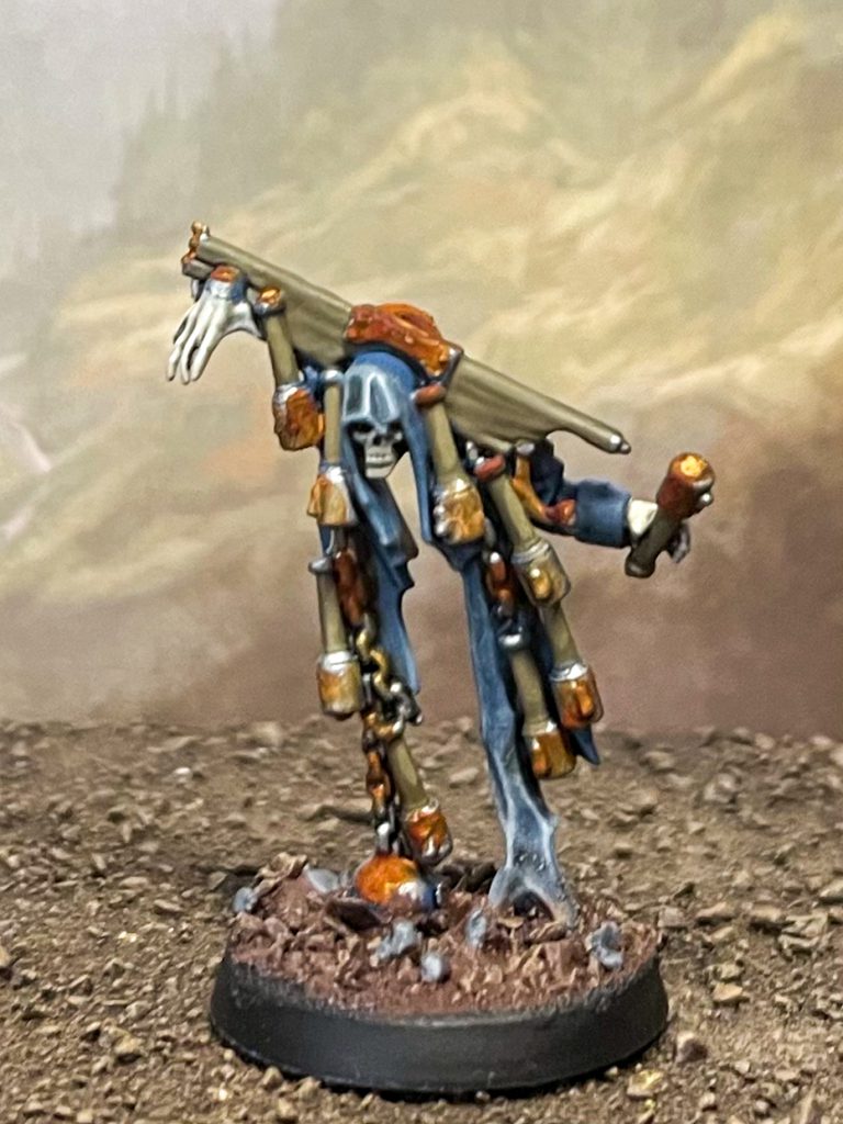 The only parts left to do is adding all of that wonderful rust and the basing! Both being incredibly simple steps. I love love love the Dirty Down Rust stuff. It’s highly toxic, smells terrible, and ruins brushes but that’s ok because it looks wonderful! I apply it to the metals somewhat thickly and then wet my brush with a bit of water and spread it around a bit. The thicker parts dry darker and the lighter adds some discolouration around the rust so it’s not such a sudden change between that and the silver. I love how the orange of the rust contrasts nicely against the blue-grey of the robes adding a sense of the reality and physicality to parts of the ghost models.