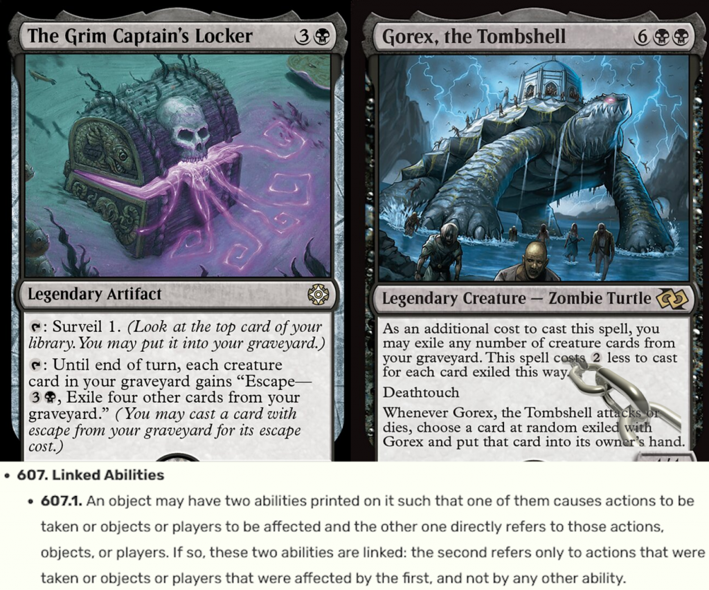 The (arguable) downside with this ability however is that, if you for example Escape Gorex via Confession Dial or The Grim Captain’s Locker, those cards exiled with Escape will not be in his pool. Why is that? This is what is known as a ‘linked ability’, described in point 607 of the comprehensive rules; the two effects on Gorex don’t actually look for ‘a card at random exiled with Gorex’, they look for specifically the cards exiled with its first ability. This means that, unfortunately, you cannot get back non-creature cards, even if they’re exiled to pay for the escape cost. Still, there is some upside in Escaping Gorex via something like The Grim Captain’s Locker, as you need only exile 2 cards to pay for the altered mana cost of {3}{B}, meaning attacking and dying gives you a 100% hit rate on the ‘random’ returns. Moreover, this interaction never muddies his pool, ensuring your randomness remains at worst a 1-in-2 (for Locker). For this reason, I remain bullish on the Locker, but don’t include Confession Dial, as we have other ways of avoiding Commander Tax, and don’t play an abundance of Legends.
