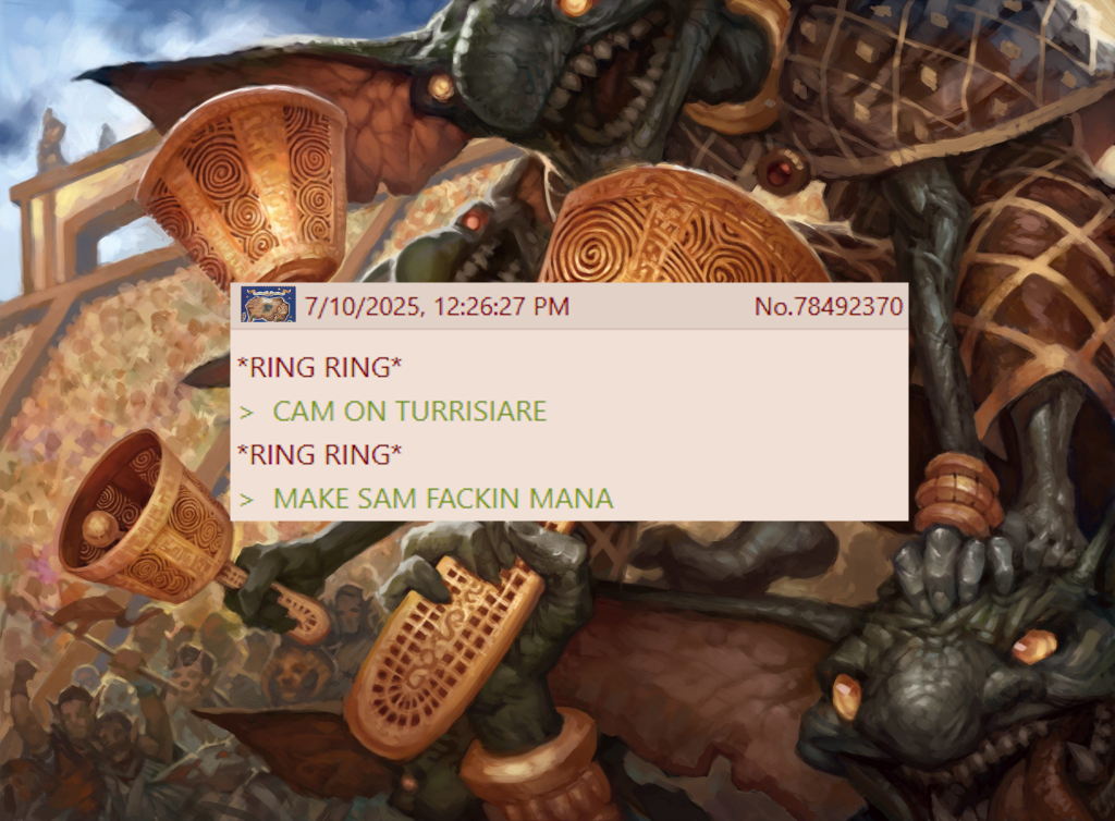 The only way baby Urza accrues enough value to be worthwhile as a Commander is by getting at least 2-3 triggers each turn cycle. Without accessing additional mana on each players’ turn, that often means you’re spending mana that could be used to develop your board state at Sorcery-speed on Instant speed looting, which only impacts the gamestate insofar as creating a mana rock. That has decent value in the early game, where you’d welcome paying 2 mana for a Signet-like, but quickly becomes something you’d much prefer to do for free after the point where those mana rocks are woven between haymakers, if at all. With that said, we do have a few ways of unlocking the delicious nectar of mana within the Powerstones generated each turn, the most alluring of which is Amulet of Vigor. For a single mana, this means every single one of your looting effects that costs {1} is now mana-neutral across the turn cycle, and the vast majority are card advantage-neutral as well. This can also be achieved, to even greater effect, with Unwinding Clock, which allows you to go mana-positive and quickly get out of hand if left unchecked. My favorite effect for this purpose, however, is a bit more humble. Not many Mana Value 3 rocks are playable, especially with a 3 mana Commander, but Victory Chimes does exactly what we need it to do, while not being as menacing as Unwinding Clock. Moreover, that mild political aspect should not be forgotten in EDH, as the phrase ‘If I only had one more mana’ is an open invitation to a Faustian bargain. There’s even the new card Moonlit Meditation from Edge of Eternities, which turns your Powerstone generation into something else, often making your value loop far spookier. This is a fairly fragile card, and I’m still in the early stages of testing with it, but when it goes off, it goes off 4 times per turn cycle. Each of these options functionally scale to game size, meaning young Urza is far more likely to live out his dream of 4 Powerstones each rotation of the table.