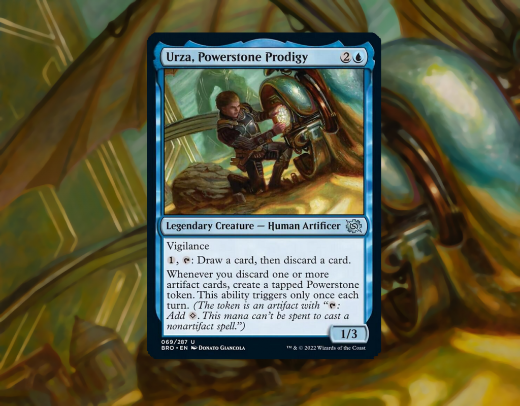 Yet, in The Brothers’ War, we got a chance to see everyone’s favorite eugenicist war criminal throughout many stages in his life, and the earliest depiction of the man who would be Urza is also a Monoblue Artifact-matters Commander, and one that leads to absurdly fun play sequences without the whole of your play group feeling bad. This is Urza, Powerstone Prodigy, bringing discard and ramp to a color sorely lacking representation in those themes. If your aim is to have more mana than the Green player, and churn through cards faster than the Red player, kid Urza might just be your guy. In order to actually get there though, we’ll need to set up reusable discard outlets, find ways to untap our Powerstone Tokens, and even just make sure we’re always able to pitch an artifact. So that we can do so, this strategy makes use of a subset Blue is getting better at tutoring with every set release: Mana Value 1 Artifacts. With Tezzeret, Cruel Captain newly released in Edge of Eternities, on top of other Artifact synergies from the set, now’s the perfect time to assemble our cabinet of gizmos and doodads looting our way to victory. Here’s a deck to hand to the one person at your FNM who refuses to drop Lord High Artificer: It’s time to dive into Urza, Powerstone Prodigy.