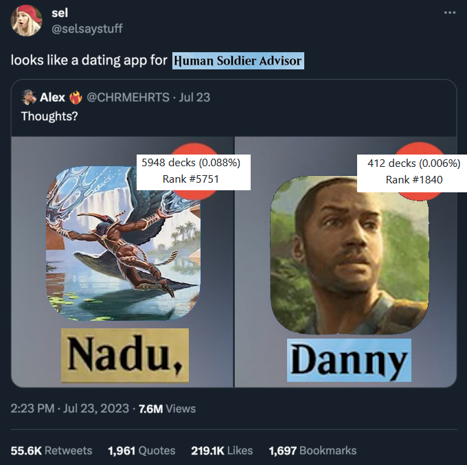We do not weep for Nadu. This is a sentiment I’ve heard echoed quite a bit across the Magic community, in spite of the rapid adoption of the Simic bird in nearly every format where he was legal. To some extent, it makes sense—this is a card that led to lengthy games that, probabilistically, would be wins but not unlike ‘Krark-ashima’ or similar had a minuscule chance to fizzle. It is, power level aside, the same sentiment that got so-called ‘Four Horsemen’ strategies exiled to the realm of slow play, with the caveat that Nadu, Winged Wisdom skirted the line by adding to the board state; at least Horsemen would 100% lead to a win, even if it took near-infinite permutations to do so. Still, it’s impossible to discount the fact that some individuals enjoyed their time with the bird, and the nearly-6000 decks on EDHREC see that gut feeling affirmed.