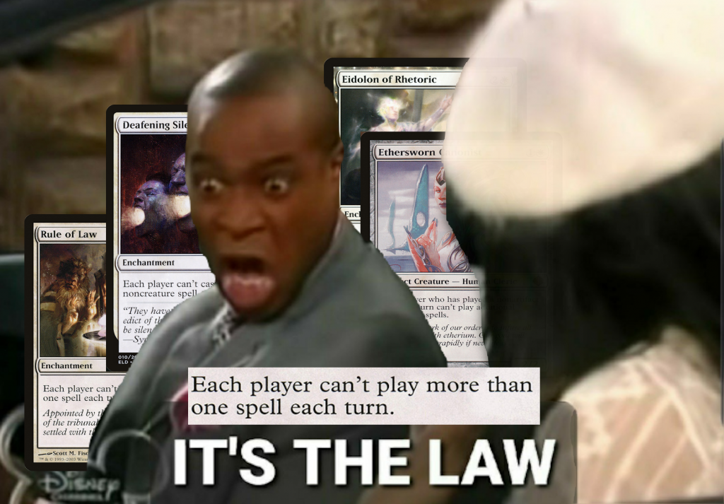 Normally the downside to loading your opponents up with oodles of resources is the inevitable fact that, gasp, they get to actually play out those cards. This is a tragedy indeed for decks like Nekusar, who aim to finish the game before the overwhelming advantage accumulation comes back to bite them, but for Monowhite, we lack the luxury of that burning clock. What White does provide, however, is the capability to limit our opponents’ abilities to empty their hands by playing their cards, through Rule of Law effects. Even if our opponents have a grip of 7+ cards, we need only worry about the single scariest card on a given turn, outside of instant-speed play. This also puts a massive crunch on control decks that might want to interact multiple times on the stack, or combo decks that need to resolve several key pieces in a single turn to win; these are incidentals for us, though they are the historical reason RoL effects see play in formats like Legacy & cEDH.