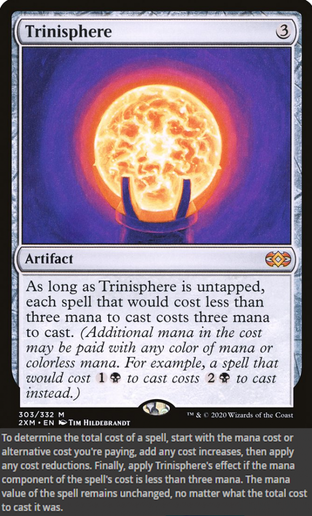 Beyond that, we’re also on the rules nightmare that is Trinisphere, which sets the minimum mana payment to {3} for any given card. This naturally hoses a lot of the unfair free spells we often see in Commander, but also supplements our RoL gameplan, requiring opponents spend that minimum payment per card played from hand, stopping a series of cheap spells from reducing their hand size too quickly. For those unaware, Trinisphere has its very own layer, meaning it is tabulated after any other changes in cost, so classic cards like Urza’s Incubator or the Medallions don’t help fight off the taxman.