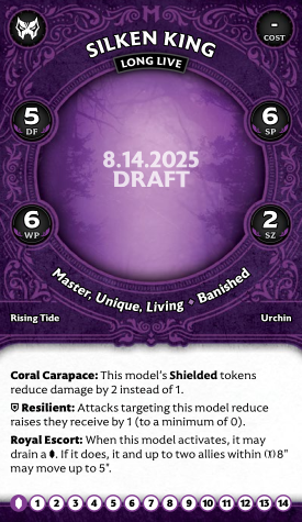 The Silken King’s original form has what you might call Archetypical Master Stats: 5/6 defensive stats, 14 health, and 6 mv. Â He’s pretty durable, as Resilient reduces raises against him by 1; this is basically 1 point of damage reduction, with the upside that it is 1) not once per activation (like many similar abilities) and 2) able to cancel various non-damaging raise effects, but the downside that it is 3) sometimes completely blank. Â His other piece of defensive tech, Coral Carapace, makes his Shielded tokens reduce damage by 2 instead of 1, which is great when you remember what Shielded tokens can reduce damage to 0. Â His last front-of-card ability, Royal Escort, lets you burn a Soulstone to get a free 5″ move at the start of your activation alongside two friends. Â This is basically “burn a Soulstone for an AP” and is thus great, with the added bonus of bringing other models along. Â You will do this a lot.