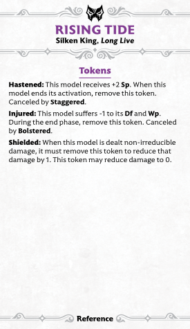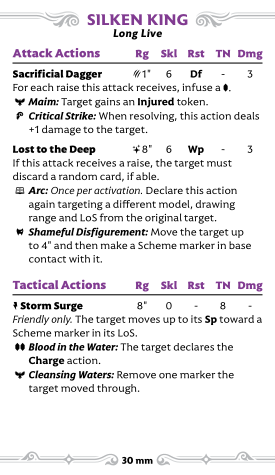 Starting with the Silken King’s original form, Long Live, we’ll look at his crew card.  Rising Tide has a simple passive effect: any of your models can eat a friendly Scheme Marker within 2″ to put opponents on a -twist to resist any attack.  Negative twists to resist are quite rare.  Your opponent can still cheat, but this applies immense hand pressure, especially because of the variety of powerful raise effects your crew has.  Better yet, with the expenditure of a Soulstone you can eat an enemy Scheme Marker for this effect, which is just back-breaking.  Attacking and counter-scheming all at once!