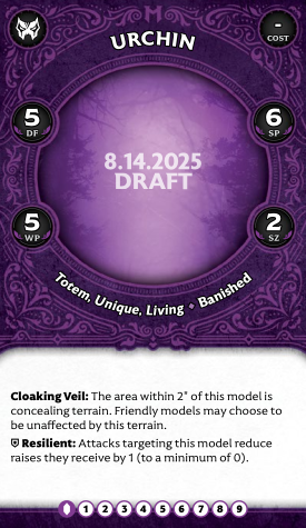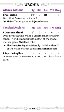 Long Live’s totem, Urchin, has “totem stats” (i.e. 5s defensively and 9 health), although it shares its master’s Resilient and its Cloaking Veil will make your opponent burn a card to hit it a lot of the time. Â It also has an attack that benefits from raises well, though the base damage of 1 is just not impressive enough to make this something worth burning resources for. Â Its tacticals are what you want: Tap the Leyline is your standard totem-draw ability, trading off the guaranteed suits (and +1 net card) from Resupply for the chance of drawing high cards off the top of your deck. Â Obscene Ritual makes a Scheme Marker within 6″ to set up the crew card ability, and also pulses out Shielded to keep his boss alive. Â He can even hand out Hastened tokens for a little surprising speed.