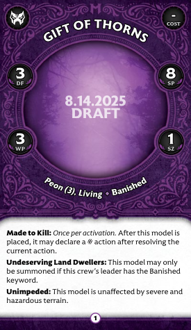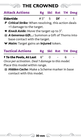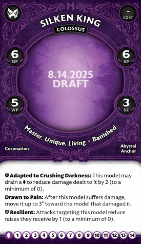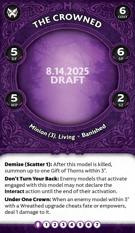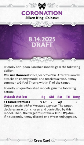 The Silken King’s title form, Colossus, has a unique play pattern that focuses on Crowns of Thorns, which I will describe alongside him. Â His crew card, Coronation, gives all non-peon Banished (remember that restriction) the ability to summon a Gift of Thorns whenever they get a Raise in an attack on an enemy, once per activation. Â Friendly unique Banished models gain the Cruel Promises signature action. Â This costs a Soulstone, but has Range 12 and Stat 7 vs. Wp, making it very reliable. Â It deals 2 damage and forces the target to take an action you control. Â What’s the catch? Â Well, to be eligible to be targeted, the enemy must have a Wreathed upgrade on them, and after the action resolves they get to take a TN 15 Wp duel to lose the upgrade.
