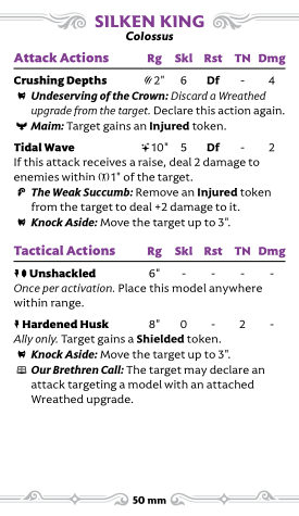 And you want him getting close, because his melee attack, Crushing Depths, is brutal.  Stat 6 with 2″ of range, it deals four base damage, a rarely-seen level of damage that hits a lot of nasty breakpoints when you start factoring in Impact tokens and raises.  It can injure enemies with Maim and, with Undeserving of the Crown, pitch Wreathed upgrades from the target to swing again.  Sure, you are losing the curse, but hitting them for another 4 damage swing means they will often just be, you know, dead.