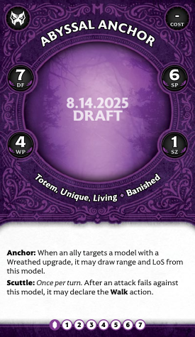 The Anchor is an odd totem, with 7 Df but only 4 Wp – which will prove a serious liability in some matchups.  When an attack fails against it, it can Scuttle, so there’s some incentive for your opponent not to casually swing, but most Wp-targeted attacks against it won’t fail.  The Anchor serves as an “arc node” allowing your other models to draw range and LOS rom it when attacking Wreathed targets, which incidentally is not limited to ranged attacks and therefore lets Colossus take his beefy 4-damage swings from safety.