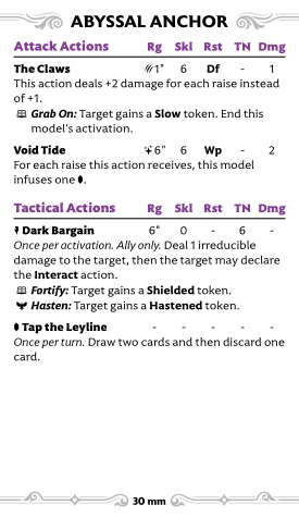 The Anchor’s melee attack, the amusingly-named The Claws, deals +2 damage from raises, but at a base damage of 1 this is not setting the world on fire.  It does have Grab On, so you can make enemies Slow at least.  Void Tide is a much more interesting attack – a 6″ range magic attack with just Damage 2, it generates a Soulstone for each Raise just like Long Live’s melee attack, and since it targets Wp you can hit enemies with Temptation on their heads and get a free Soulstone or two.