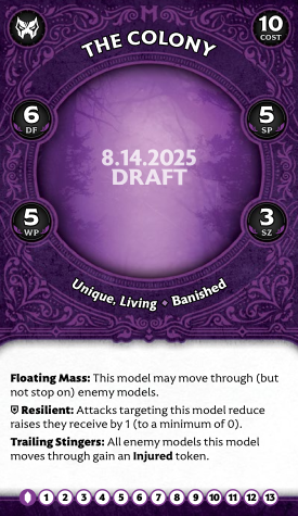 The Banished’s 10-stone beefcake, the Colony is a hefty mass of Resilient wounds that won’t go down easily. Â Floating Mass lets it pass through enemies, and Trailing Stingers gives them Injured when it does, which is a nice little incidental debuff that will make hitting enemies with your various gnarly attacks easier.