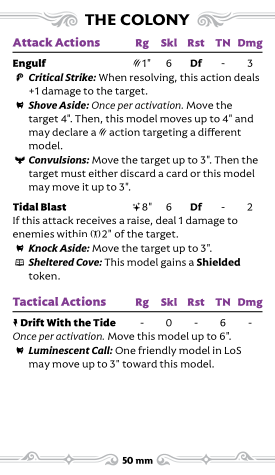 Speaking of gnarly attacks, the Colony has a bog-standard Stat 6, 3 damage swing with both Critical Strike and Shove Aside for bonus damage and extra attacks, respectively. Â Tidal Blast is not the world’s most impressive ranged attack (though pulsing out damage on a Raise is nice), but being able to punt someone off a point from 8″ away is not to be sneezed at. Â Drift With the Tide is what you want on a signature action: an extra AP, with the extra frisson here of being able to move through enemies and Injure them.