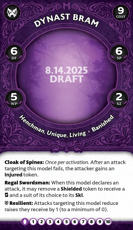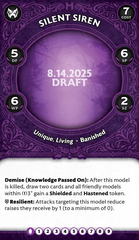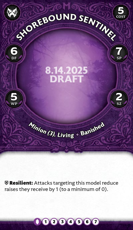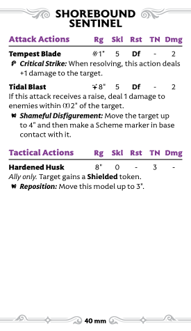 The first Banished minion, Sentinels are pretty durable for 5ss – 6/5 defensive stats with 7 health and Resilient.  They’re fast, too, at 7 mv.  Their melee attack isn’t great, even with critical strike, and neither is their ranged attack, although Shameful Disfigurement is a very good trigger.  They have Hardened Husk, but it’s not a Signature action and so you may not want to use it often.  Long Live’s crew card at least gives them a signature action, although they will have to spend a stone for it.