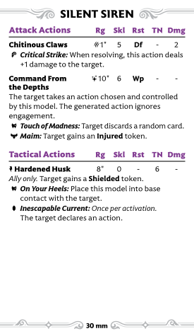 So what does she actually do? Â Well, Chitinous Claws is not a very impressive melee attack, even with Critical Strike. Â Instead, you will most often be using Command From the Depths: a range 10, stat 6 Obey. Â That is, for the uninitiated: an attack whose effect is to force the target to take an action under your control. Â This one can’t target friendlies, as some can, but as some consolation it has no TN and allows the generated action to ignore engagement – letting your target charge or interact! Â It even has good triggers.