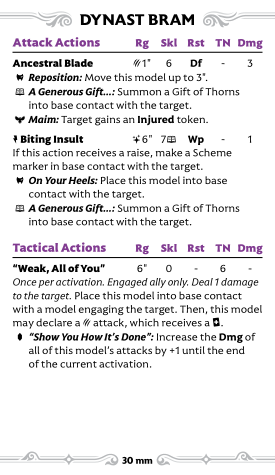 Bram’s Signature attack, Biting Insult, only does 1 damage (with no more from Raises, since it’s a magic attack), but it is Stat 7, and getting a Raise gives you a free Scheme Marker near the enemy, ready to be cashed in for Undertow. Â There’s a built-in trigger to summon a Gift of Thorns, but you can also use On Your Heels to teleport into base contact with the target, ready to swing with the Ancestral Blade and use that newly made Scheme Marker for Undertow.