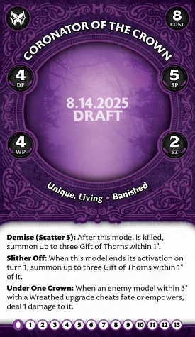 The last Banished unique is an odd one.  The Coronator has awful defensive stats but a shitload of hit points, especially for an 8-cost model.  It can be hired by either Silken King, but basically everything on this card points to Colossus.  For starters, when it ends its activation on Turn 1, you summon three Gift of Thorns within 1″ of it.  The dream, of course, is to summon them within 3″ of three different enemy models, but that will require placing a slow and extremely vulnerable Coronator in a very dicey spot.  Still, even if you can only end up near one enemy, you can get three chances to drop a Wreathed upgrade on them.  You also get three Gifts when the Coronator dies, which is funny and will making killing this thing in melee pretty uncomfortable.  Its last front of card ability punishes nearby Wreathed enemies when they cheat or empower, which is nice, but frankly if you are Wreathed then you sort of have bigger problems to worry about.