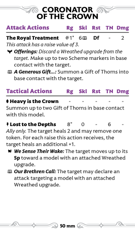 The Coronator’s melee attack, The Royal Treatment, isn’t that impressive, though the raise value of 3 is nice.  It has a built-in trigger to summon a Gift (and, remember, get that Made to Kill attack), and you can cash in a Wreathed upgrade from your target to get two Scheme Markers.  That’s rare and pretty impressive, though losing the upgrade from the target hurts.