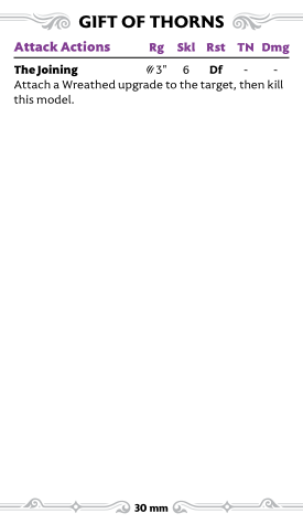 I have to mention these guys now, since they’re so key to how Colossus plays. Â You cannot hire them, only summon them, and you can only summon them if playing Banished, so they’re sort of like a second totem for Colossus. Â They’re extremely simple: they’re Peons with worthless defensive stats (but Mv 8 Unimpeded for some reason) and Made to Kill, which lets them make a melee attack then they are placed (such as when they are summoned). Â Their melee attack, The Joining, has range 3″ and stat 6 and does no damage. Â It just kills the Gift and puts a Wreathed upgrade on the target.