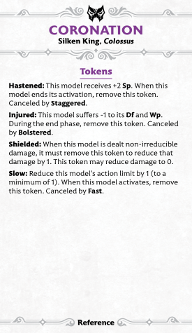The Coronator can also just spend a Soulstone to get two Gifts in base contact, and as a Signature action it can heal allies, with bonus token removal. Â The triggers on his heal are nice too, letting your friend push to or attack a Wreathed opponent.