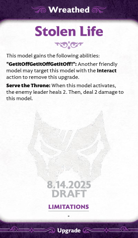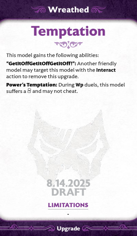 So what’s a Wreathed upgrade? Well, there are three of them.  They all share the “GetItOffGetItOffGetItOff!” rule, which lets your opponent’s other models target the unfortunate curse-bearer with the Interact action to remove the upgrade.  Each one has a separate effect: