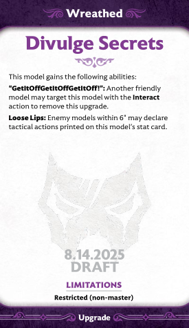 - Divulge Secrets lets enemies (that is, your models) declare the cursed target’s tactical actions while they are within 6″ of it.  Sometimes, depending on the target, this is very nasty.