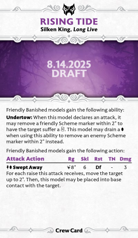 Starting with the Silken King’s original form, Long Live, we’ll look at his crew card.  Rising Tide has a simple passive effect: any of your models can eat a friendly Scheme Marker within 2″ to put opponents on a -twist to resist any attack.  Negative twists to resist are quite rare.  Your opponent can still cheat, but this applies immense hand pressure, especially because of the variety of powerful raise effects your crew has.  Better yet, with the expenditure of a Soulstone you can eat an enemy Scheme Marker for this effect, which is just back-breaking.  Attacking and counter-scheming all at once!