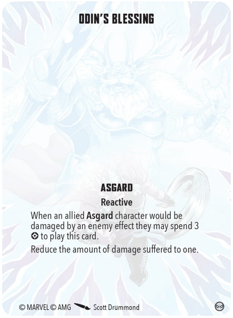 Odin’s Blessing is one of the pre-eminent tactics cards in the game. The ability to functionally nullify a single attack is phenomenally powerful. This should make the short list for just about any Asgardian crisis team. It is limited to only affiliated characters.