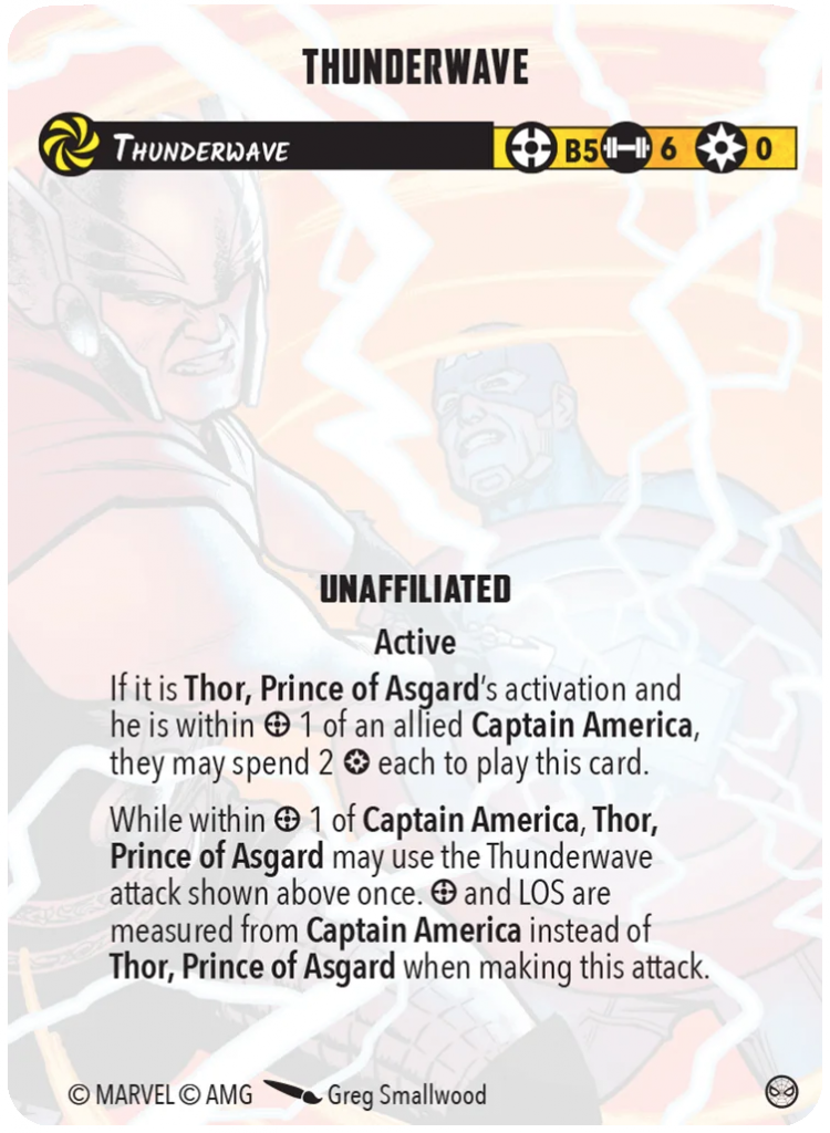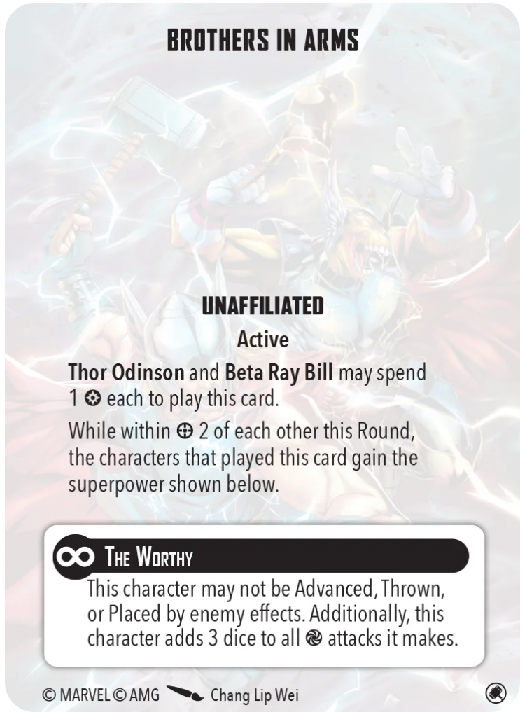 Thor and Bill also add three dice to their energy attacks while they remain in range two of each other. For Bill, this means Summon the Storm and Godhunter are both monstrous attacks. While Hero of Midgard gains the benefit of this card for his builder (which is notably reduced from the absurdity of his release days) Prince Thor only has one energy attack, God of Thunder. Since Bill and Thor have to be within range two of each other, and Thor’s attack is A2, Bill has to take collateral damage (or ignore it with his Korbinite Cybernetics for a cost of one power). This attack is likely not the reason you would reach for the card, but I did get to use it once with Thor’s area attack, and it was fun.