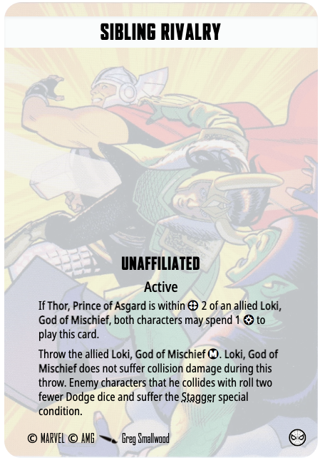 Thor’s other Asgardian team up is specific to Prince Thor and the original Loki, the God of Mischief. Thor and Loki, within range two of each other, during any of your activations, may spend one power each to throw Loki medium. If Loki collides with another character, that character rolls two fewer dice to dodge, and suffers the Stagger special condition if they take damage.