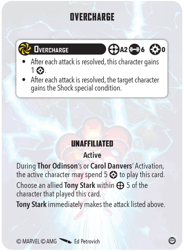 For five power, any Thor Odinson or Carol Danvers can give Tony Stark a free, out of activation area attack that automatically shocks any targets and gives Tony one power per target.