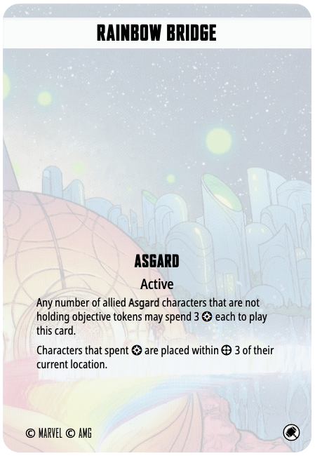 Rainbow Bridge offers some extra movement to any number of Asgardian characters may spend three power to place range three away. Considering Bill, Skurge, Loki, Loki, Angela, Enchantress, and Heimdall all lack a charge, this is a solid way to get some extra movement. Movement outside of a model’s activation can be powerful as well, to pull a model to safety or hop to contest or capture an objective at the end of a round. Characters holding objectives cannot use this card. They can’t even drop an objective to take advantage of the card.