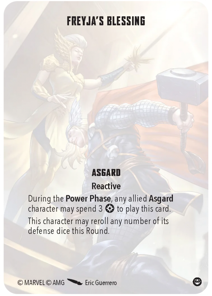 When Freyja offers her blessing to any affiliated character, they get to reroll any number of defense dice through the round in exchange for three power. This can be a way to keep an important model on the table for longer. Unfortunately for Freyja, Asgard is spoiled for choice, so this card is competing against some very good ones.