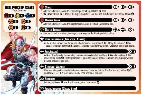 In my mind, Thor’s real strength comes from being the Strongest Avenger. A size four character or terrain throw at range medium is top tier. There are only a couple of models that Thor can’t throw. He can displace most models. Alternatively, he can add up to five damage to an activation for the cost of three power.