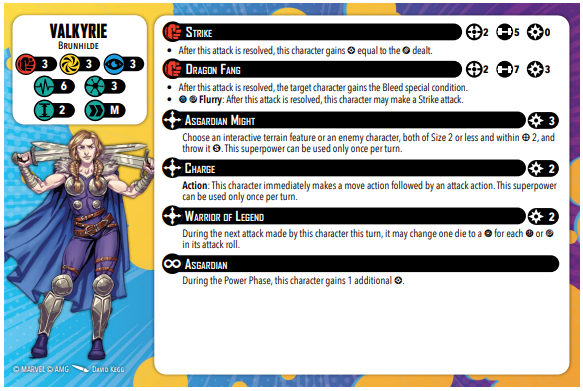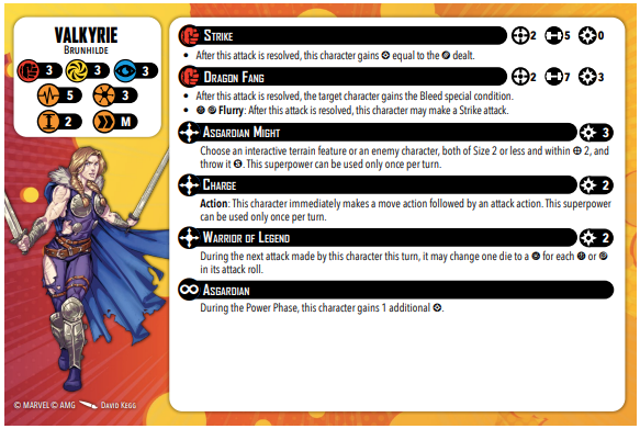 Valkyrie’s stat line begins like many other three threat characters: three for all of her defenses, eleven stamina with six on the front and five on her injured side. This means that it’s important to carefully consider where and when to have Valkyrie rush in, because she has a tendency to daze quickly.
