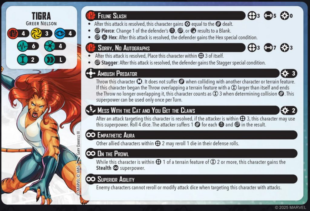 Her spender is Sorry, No Autographs, a range 3, 7-dice physical attack for 3 power. After the attack, Tigra can place herself within range 3, and on a wild, it gives the Stagger condition. Stagger is probably the strongest special condition in the game, and a wild on 7 dice should happen around 65% of the time. For 3 power, the ability to move, damage an opponent, and potentially stagger them is promising.