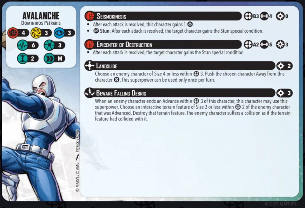 Epicenter of Destruction is his spender. A five dice, area 2 physical attack for 3 power that automatically gives out stun after each attack is resolved. 3 power is relatively cheap for a spender, but a five dice physical attack is nothing to write home about. Most of the time Avalanche is probably better off using his beam unless you absolutely need the stun.
