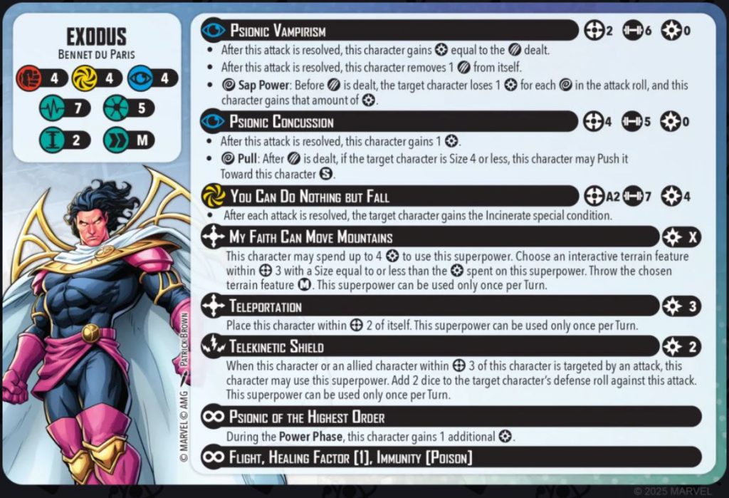 For base stats, Exodus is a 5 threat character with 4 defence in all areas. He is 7 health on both his healthy and injured side, which gives him slightly above average defences for a 5 threat. A small base medium move is nothing to write home about but flight will help on terrain dense boards.