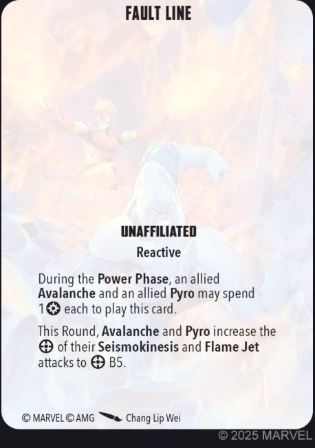 Fault Line is an unaffiliated reactive card that Pyro and Avalanche can play 1 power each to play. This round Avalanche and Pyro increase the range of their beam attacks to 5. On certain map types where the secures are lined up this could be interesting. It’s certainly more interesting on Pyro than Avalanche as Pyro can add dice to the beam with his Stoke the Flame ability. Avalanche’s beam will only ever be four dice. Additionally, Pyro can bounce incinerate to multiple people with Fire manipulation, and this could help that. Overall, because of how lackluster Avalanches beam is, I’m not convinced this is worth it outside of fun games. On top of that, the War of Kings Crisis Pack has removed most of the down-the-middle Crises that would love a beam like this. C-