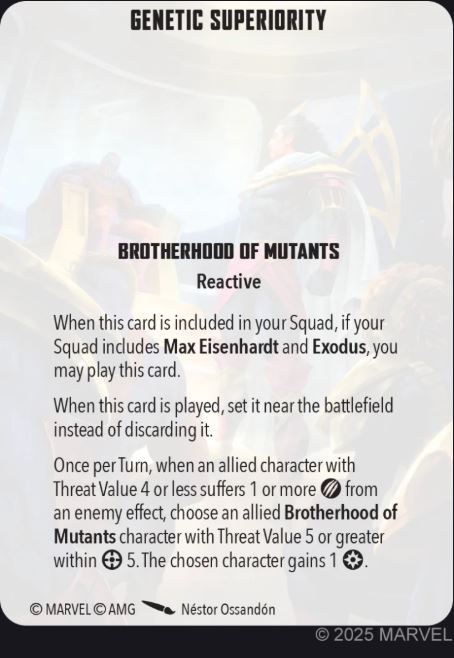 Genetic Superiority is another reactive Brotherhood of Mutants Card. If your squad includes both Magneto and Exodus, you can play this card at the start of the game and set it up next to the battlefield. Once per turn, when an allied character with a threat value 4 or less suffers 1 or more damage from an enemy effect, you can select a character with a threat value of 5 or more to gain power. This effect is quite strong and gives you a pseudo A-Force leadership. The issue is that it requires 11 threat worth of characters to work. On top of that, if you are taking Magneto you probably already have access to his leadership which will already give you more power than you need.