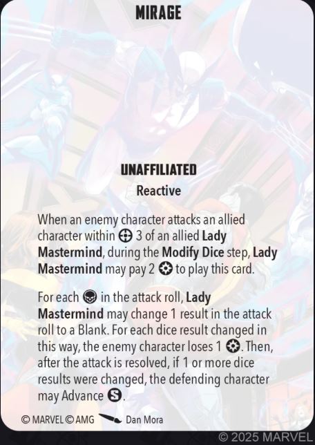 Mirage is an unaffiliated reactive tactics card. When an enemy attacks an ally within range 3 of Lady Mastermind, she can pay 2 power in the modify dice step. For each skull in their roll, you can change a result to a blank. For each dice changed this way, the enemy loses a power and then after the attack defending character can advance short.