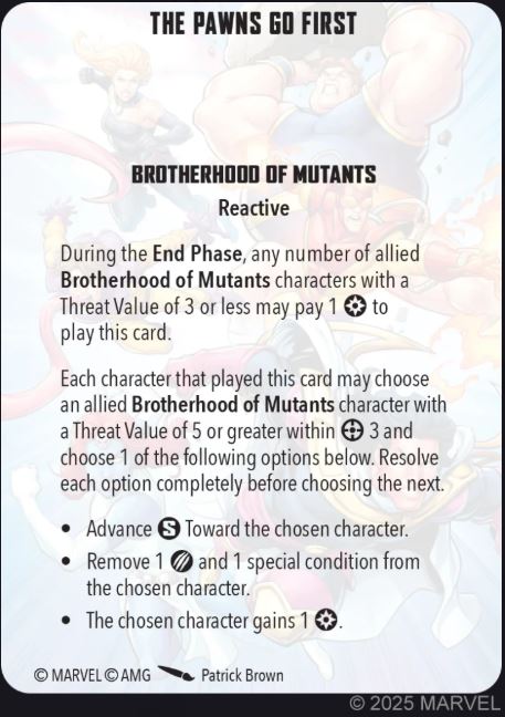 Any number of Brotherhood characters that are 3 threat or less can play the card for one power. Each one that did can choose a Brotherhood character of 5 threat or more and choose one of 3 effects. Advance toward the chosen character, remove a damage and special condition from the character or give the chosen character an extra power.