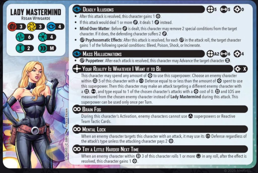 Lady Mastermind looks to be one of the most fun characters that AMG have made in a long while. It will likely take a bit of skill to pilot her properly, as you need a good understanding of what 0-cost attacks your opponent has access to, and you’ll need to pay attention to opponents rolling dice near her to keep her topped up on power. She will have interesting play in her home affiliation of the Brotherhood of mutants and may also see play in affiliations that can give out a lot of special conditions, such as Baron Strucker’s Hyrda. A-